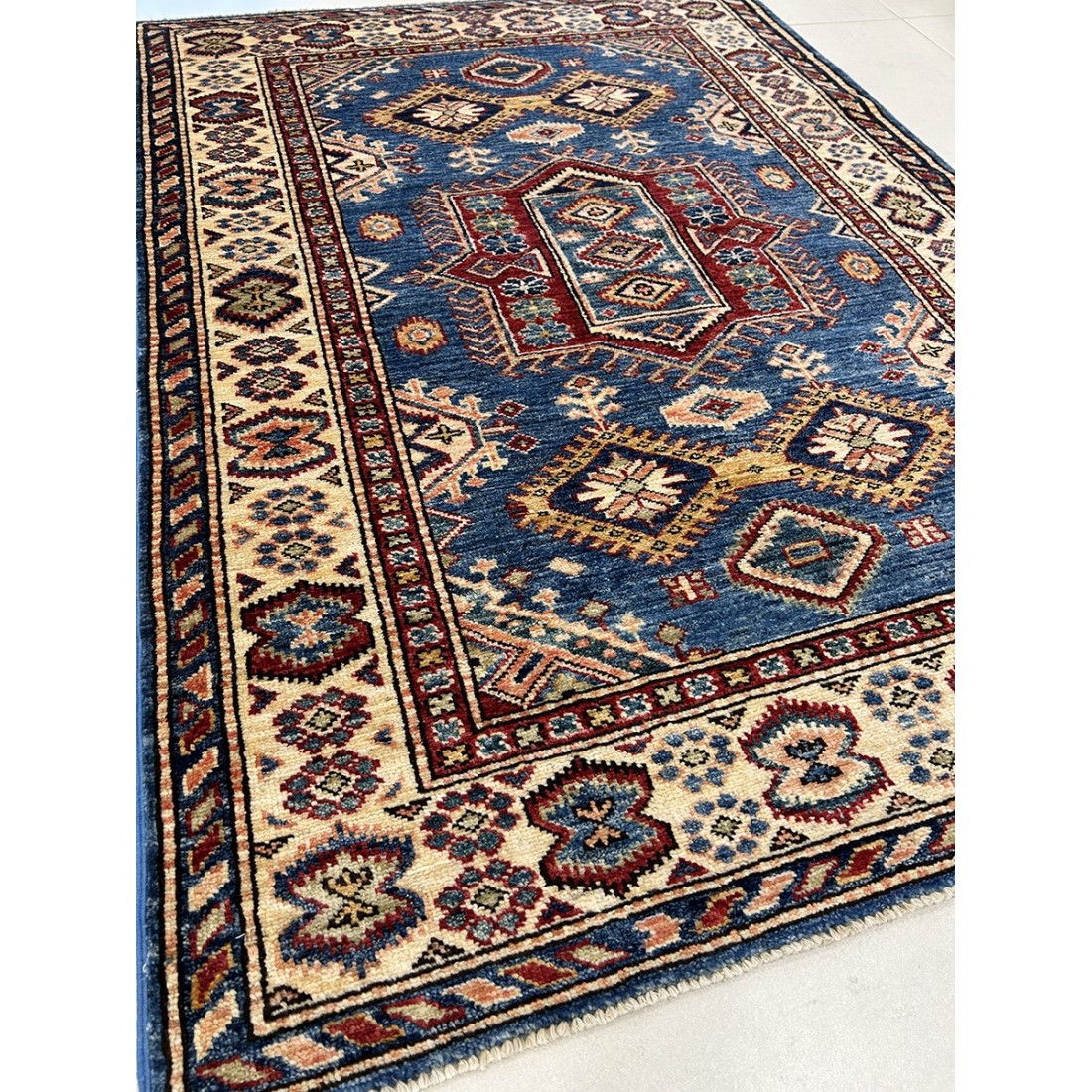 Tappeto kazak qualità extra disegno geometrico con fondo blu con cornice beige misura 102x139 cm annodato a mano in Pakistan seguendo la tradizione nata in Persia.