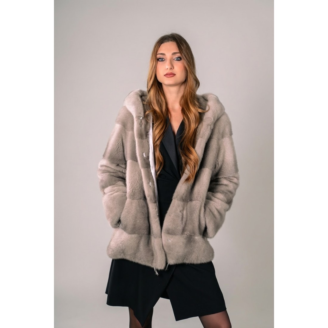 giacca in pelliccia di visone con cappuccio, offre una texture morbida e una lucentezza naturale che valorizza ogni outfit.