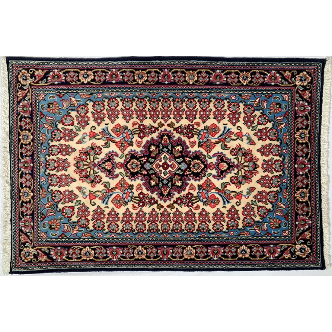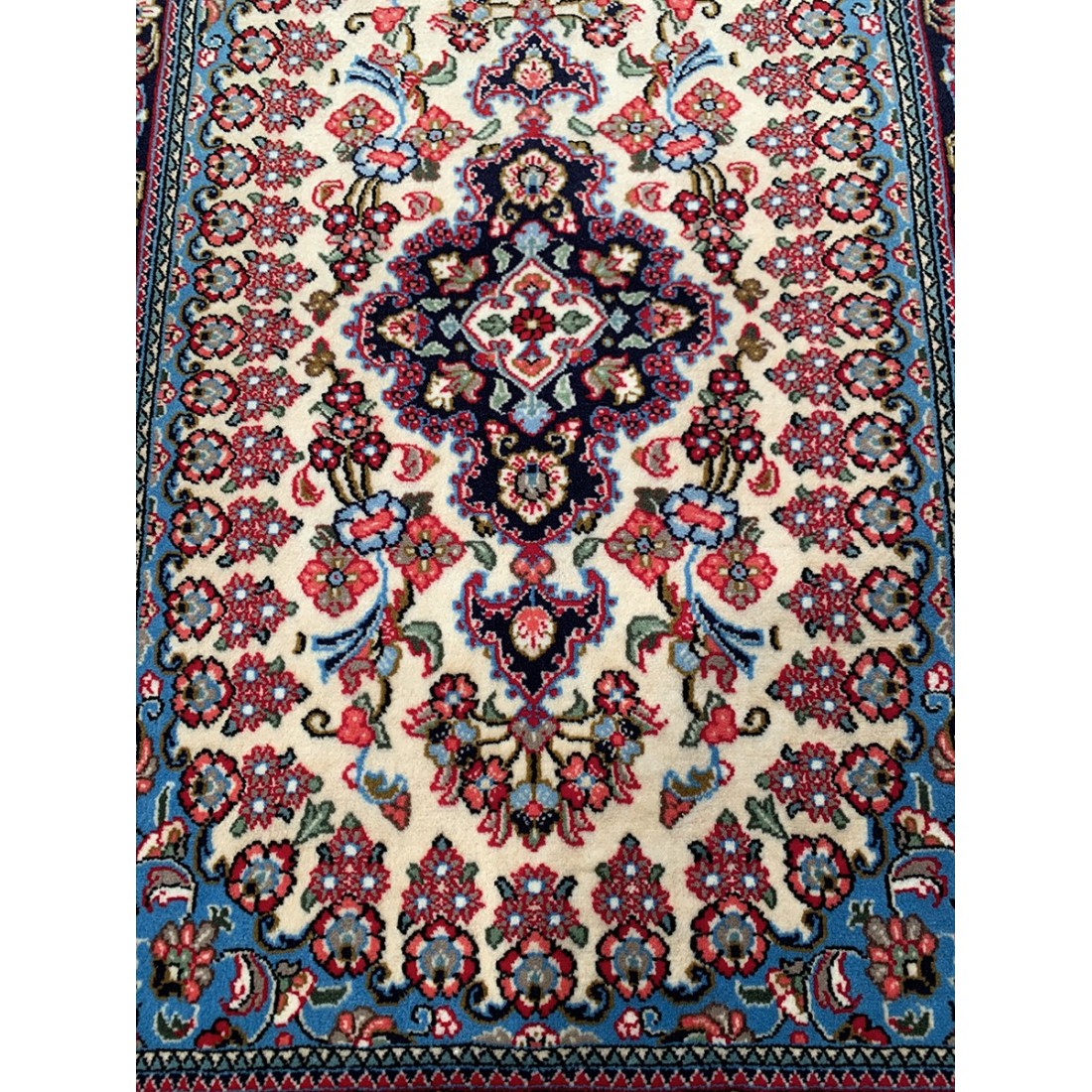 Tappeto persiano Qum misura 84x123 cm disegno floreale , fondo chiaro e cornice blu.