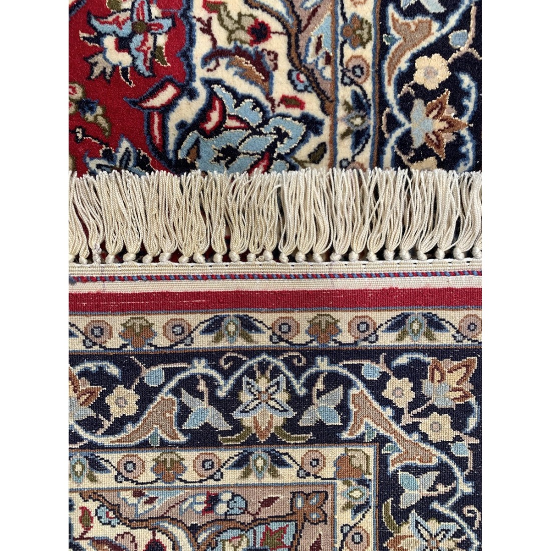 Tappeto persiano Isfahan rosso annodato a mano misura 70x103 cm colore fondo rosso con cornice blu e panna.