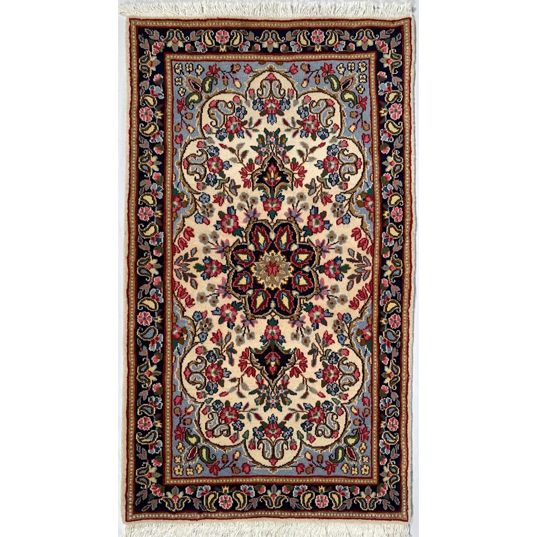 Tappeto persiano classico originale kirman in lana misura 88x158 annodato a mano nella città di Kirman, nella Persia sud orientale, il colore del fondo è beige con cornice blu.