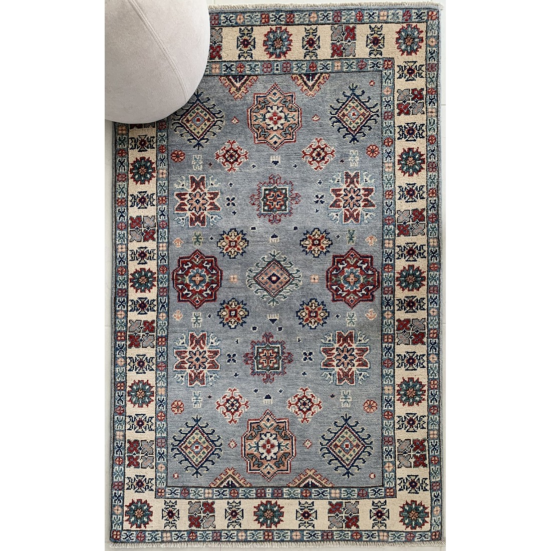 Tappeto Kazak, annodato a mano nella regione del Caucaso, misura 147x87 cm fondo grigio con cornice beige.
