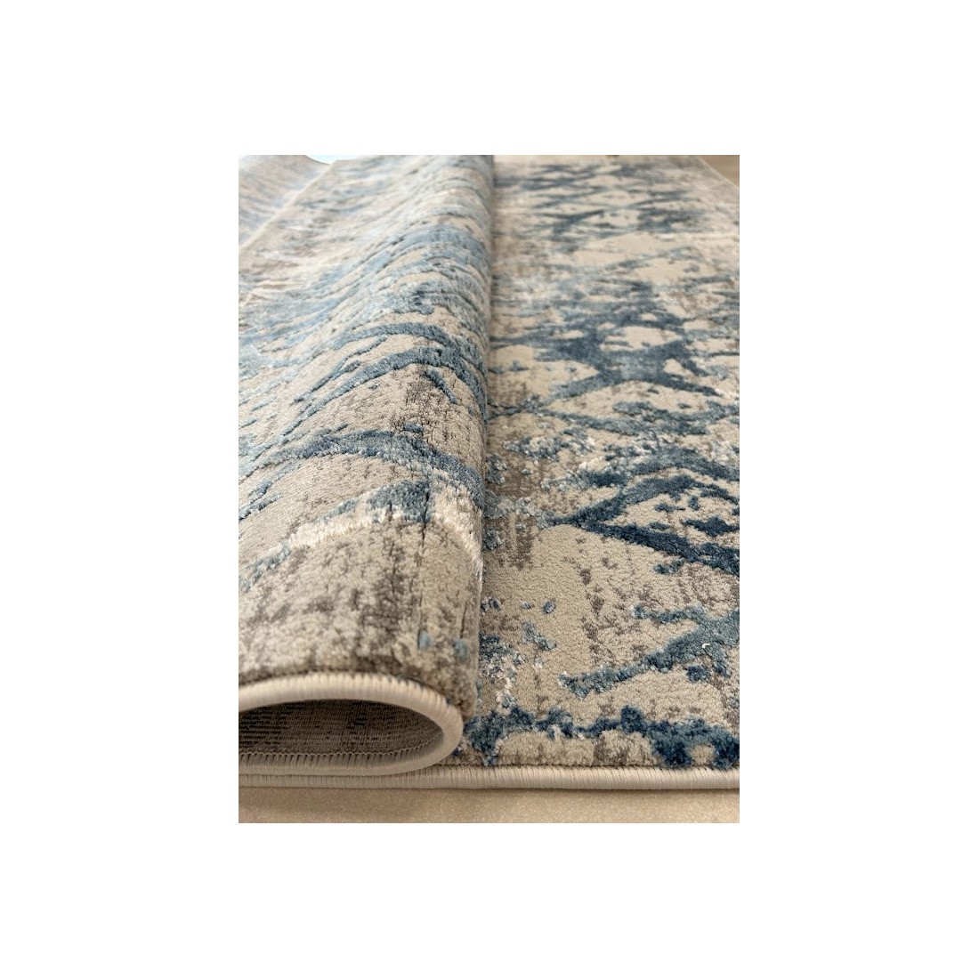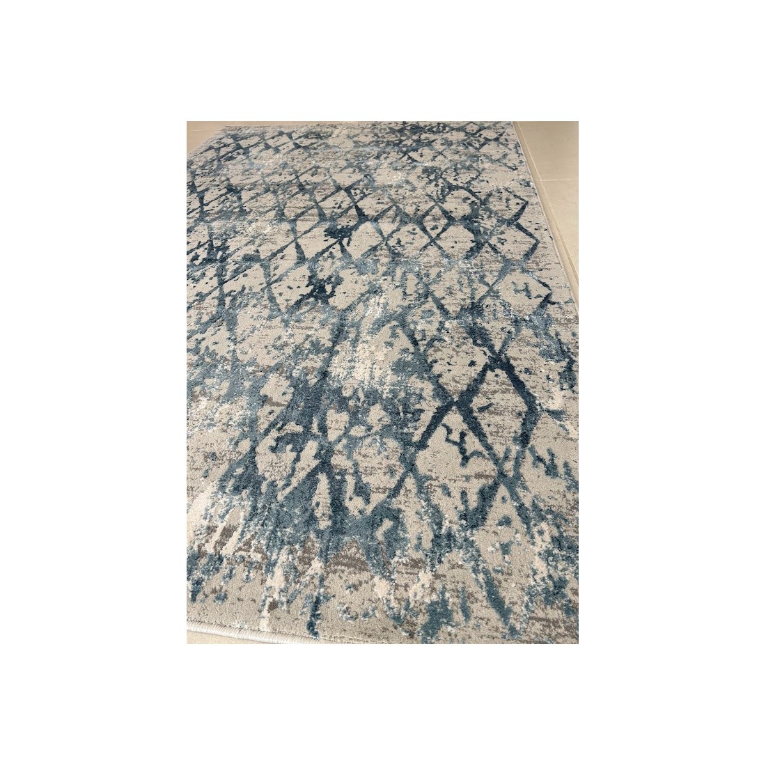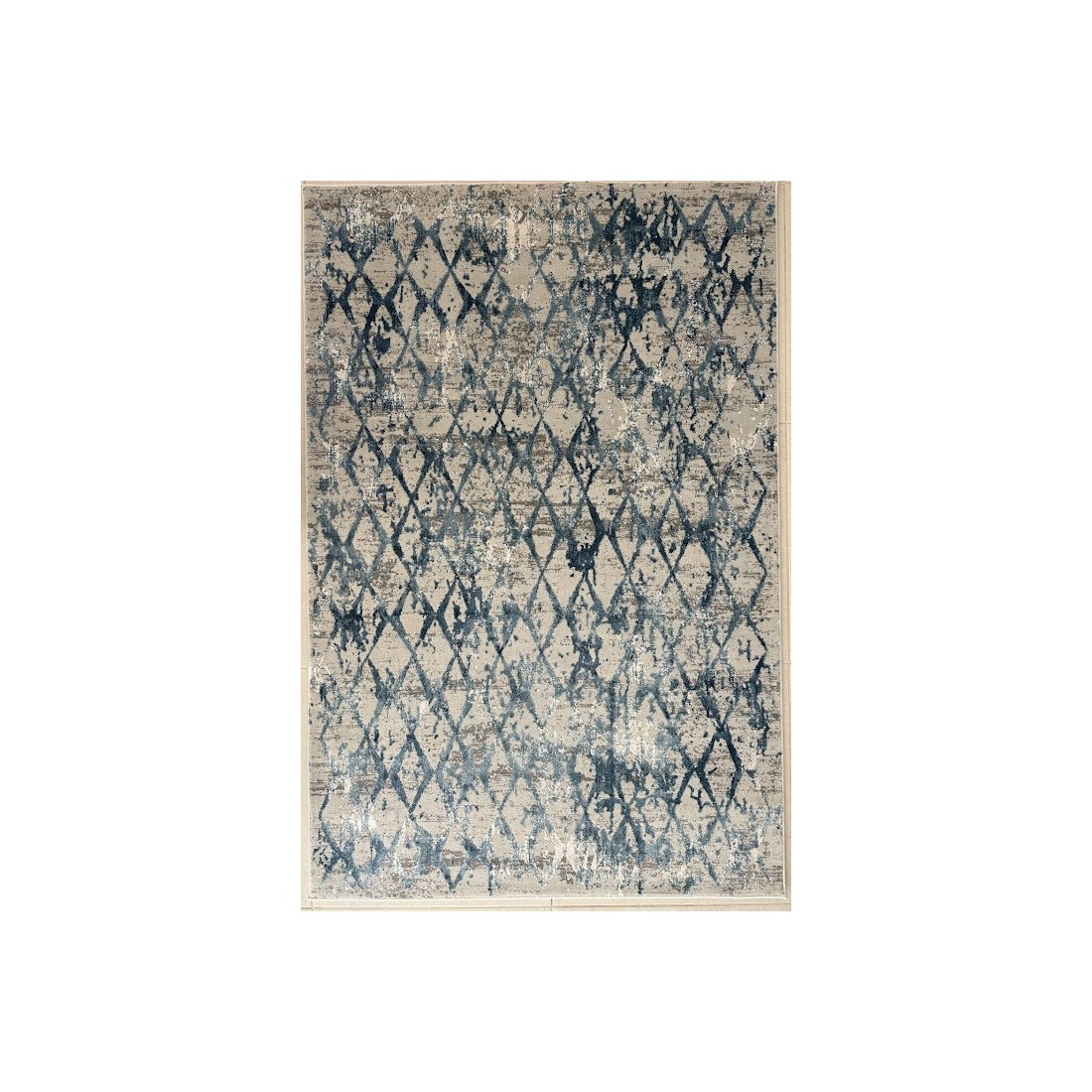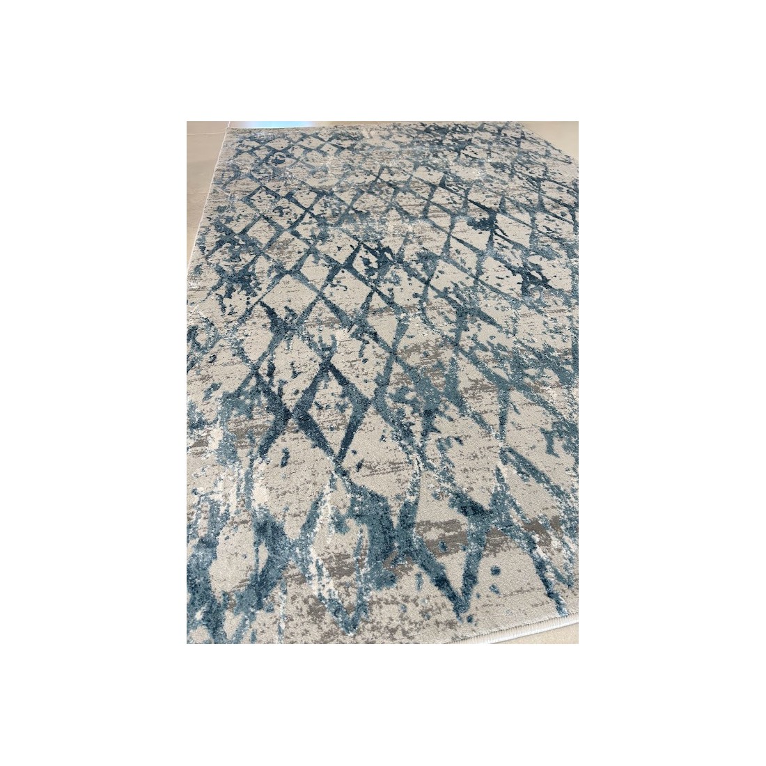 Tappeto moderno Montreal annodato a macchina con lane sintetiche, il disegno è geometrico con i colori del grigio e dell' azzurro.