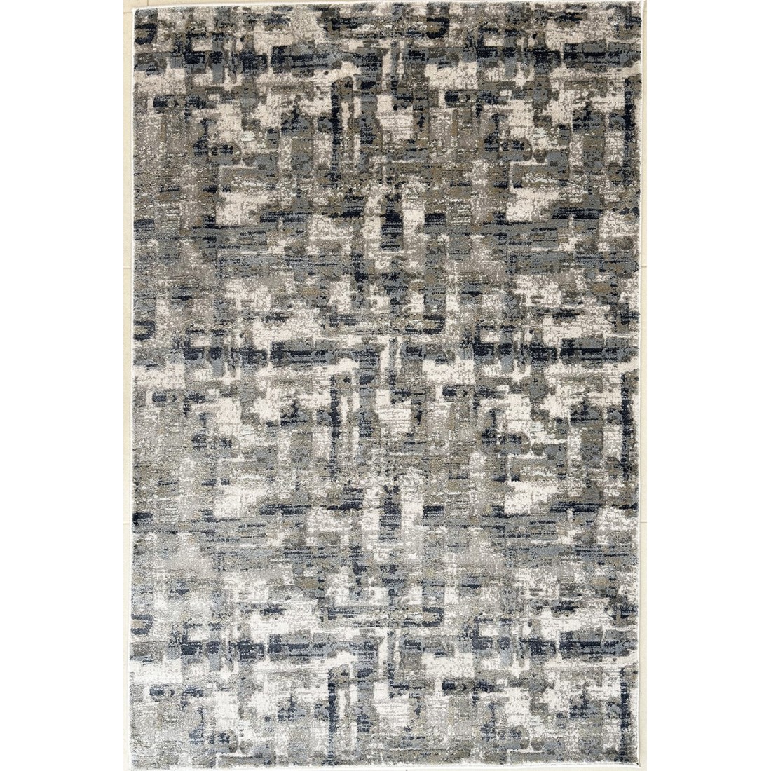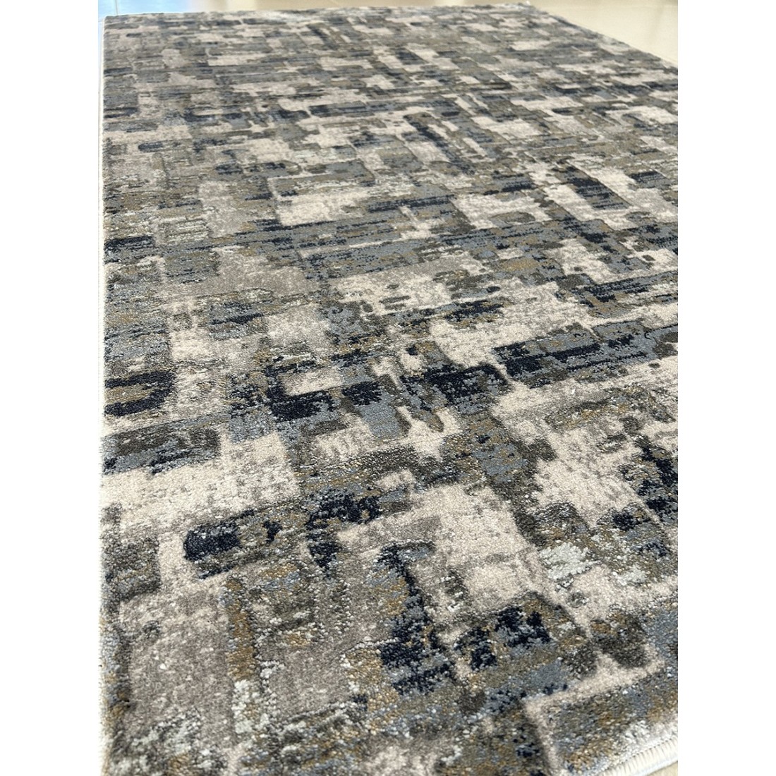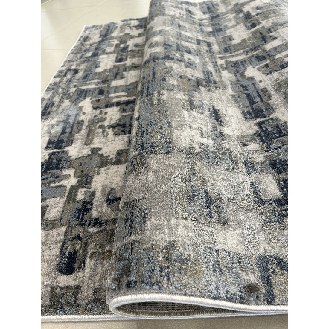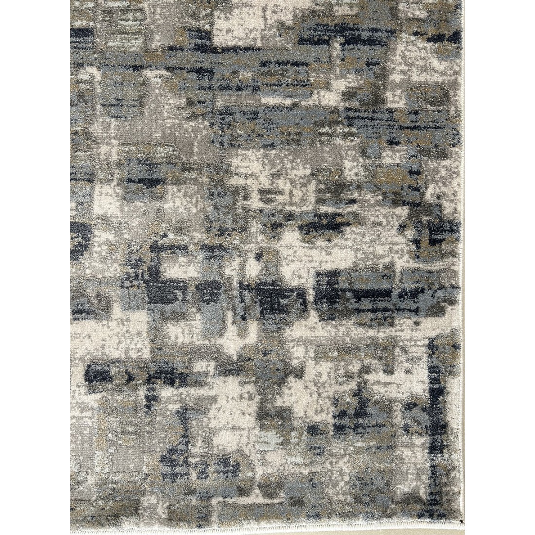 Tappeto moderno Castilla annodato a macchina in Poliestere e viscosa, il fondo è grigio con sfumature tortora e blu.