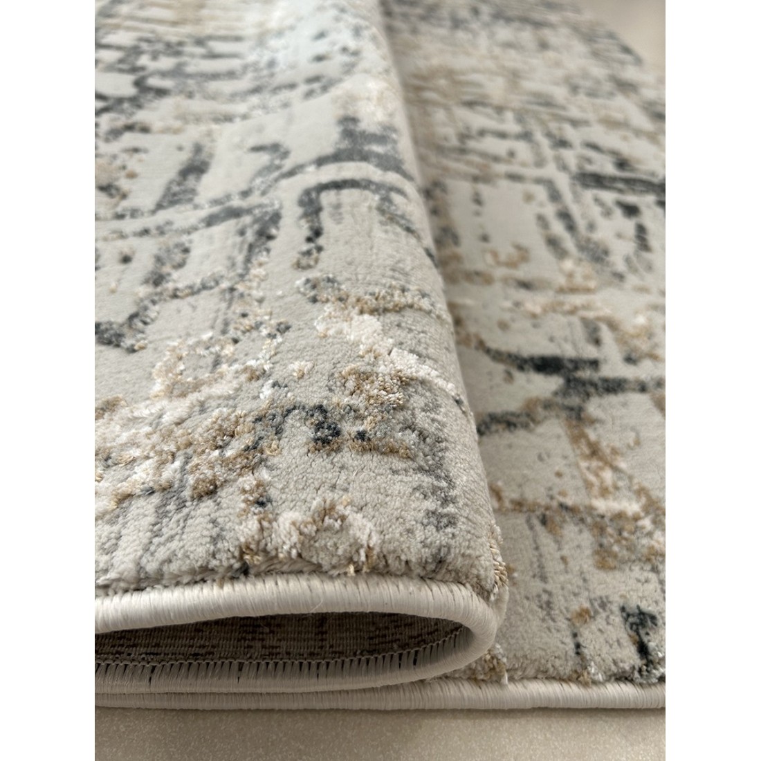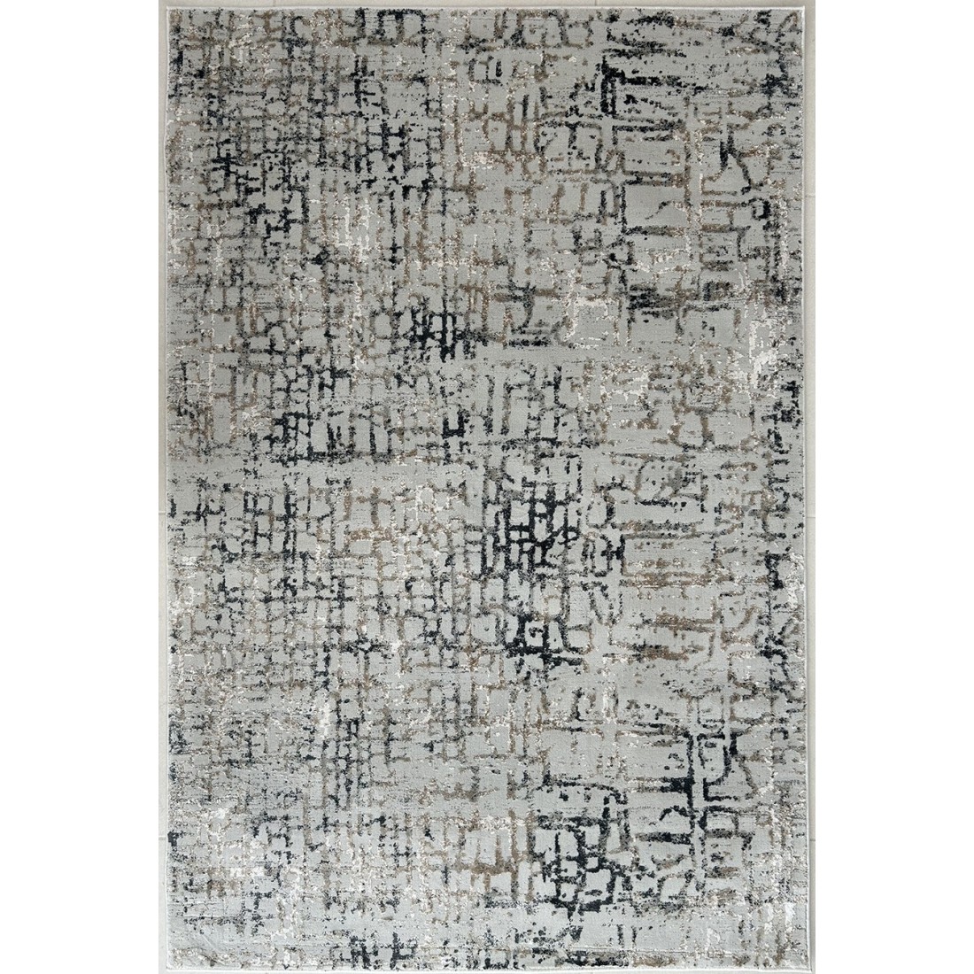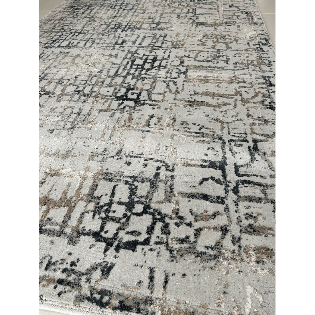 Tappeto moderno Montreal annodato a macchina in viscosa e poliestere, il fondo è grigio con disegni geometrici tortora e beige.